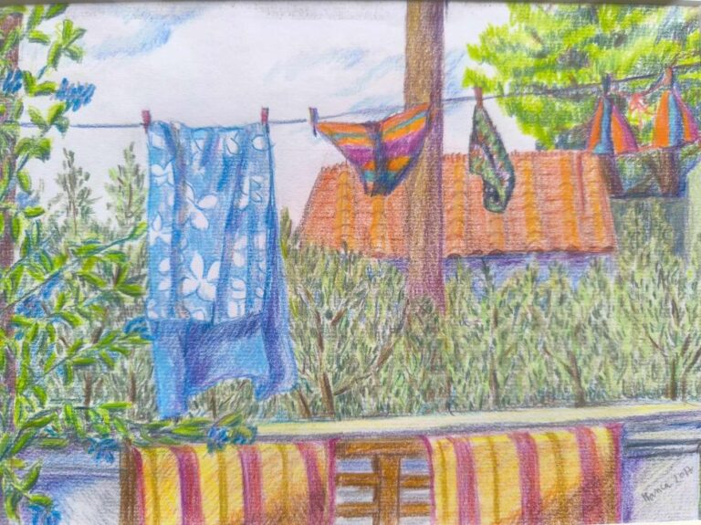 Njene slike manjšega formata (tehnika suhe barvice na papir) so polne topline in spokojnosti. Gre za  »dnevniške zapise« lepih trenutkov s počitnic, ko smo sproščeni, imamo čas in na svet gledamo malce drugače.