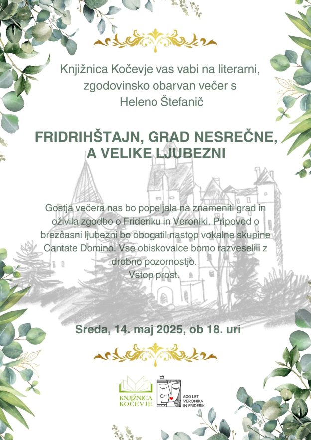 Pridružite se nam na literarnem večeru, ki ga bomo preživeli v družbi domačinke, gospe Helene Štefanič. Prisluhnili bomo predstavitvi njenega literarnega ustvarjanja, še posebej pa nepozabni in usodni ljubezni med lepo Veroniko in mogočnim Friderikom. Pika na i pa bo glasbeni nastop vokalne skupine Cantate Domino.