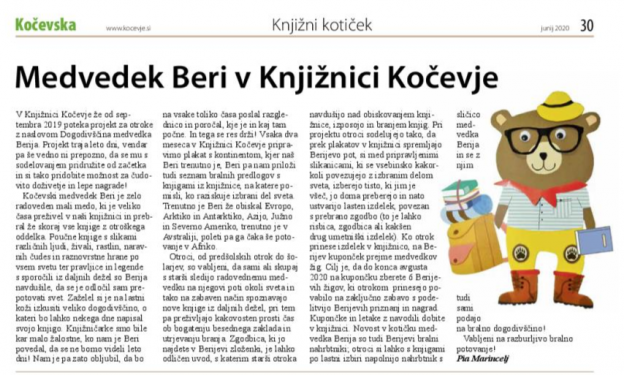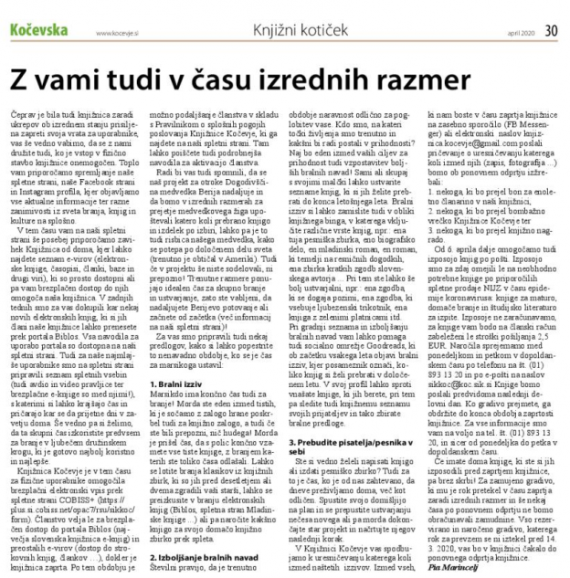 Knjižnica Kočevje vsak mesec prispeva opise štirih knjig, ki jih priporoča v branje (navadno na straneh 30 ali 31). Knjižnica Kočevje občasno prispeva tudi lastne članke z aktualnimi vsebinami s področja bralne kulture. Elektronska verzija časopisa je prosto dostopna tudi na spletu.