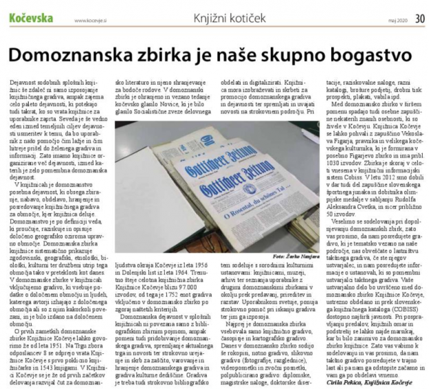Knjižnica Kočevje sodeluje z občinskim mesečnim časopisom Kočevska, ki navadno izide 22. dne v mesecu. Vsebina časopisa Kočevska ponuja različna področja od gospodarstva, športa, kulture, novic iz šolskih klopi, zanimivosti, osrednjega intervjuja ter še veliko drugih novic s širšega področja Kočevske.